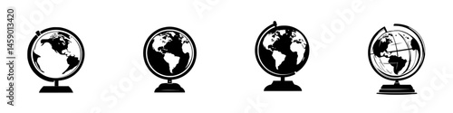Assorted flat black globe icons representing different geographical perspectives and designs suitable for various digital applications