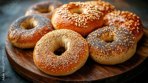 Assorted fresh baked bagels with sesame poppy and toppings on a wooden serving board close up in a bakery or café setting