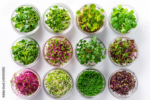 Assorted Fresh Microgreens Varieties in Clear Containers Isolated on White Background