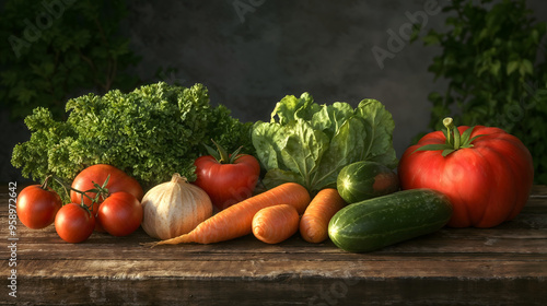 Assorted fresh vegetables on wooden table, farm-to-table concept