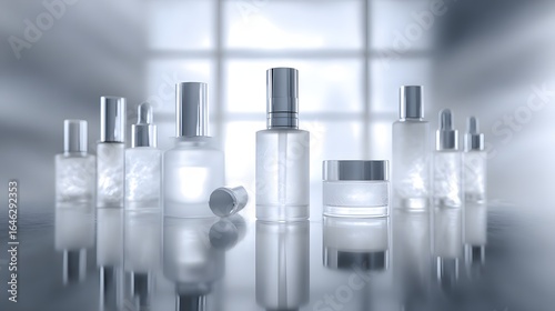 Assorted frosted glass cosmetic containers on a reflective surface.