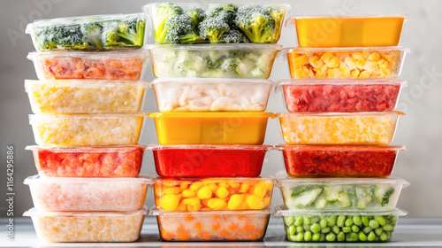 Assorted frozen vegetables in plastic containers for healthy meal prep