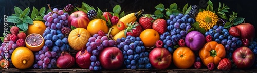 Assorted fruits and vegetables in a basket psychedelic vibrant colors intricate detail