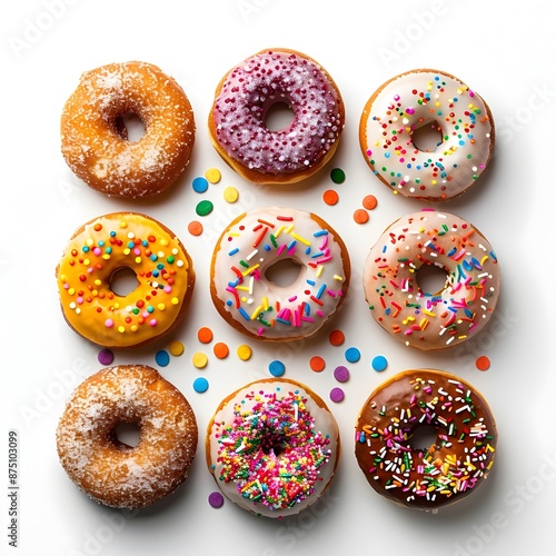 Assorted Glazed Donuts with Colorful Sprinkles Arranged in a Circle on White Background