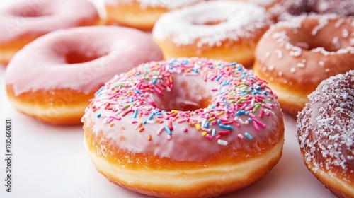 assorted glazed donuts with colorful sprinkles on a bright white background ideal for dessert or bakery themed advertisements
