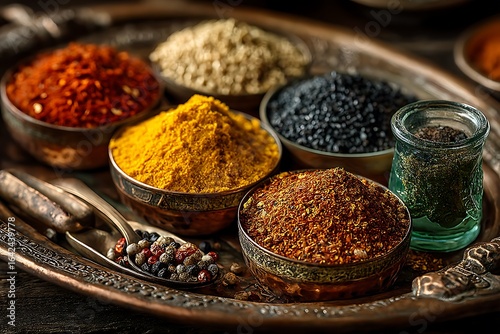 Assorted gourmet spices in rustic copper high resolution wallpaper