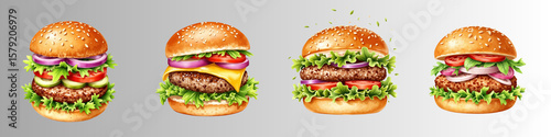 Assorted hamburgers with fresh ingredients on gray background