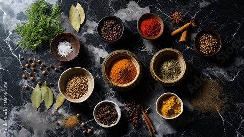 Assorted herbs and spices arranged on dark marble, showcasing vibrant colors and rich textures.