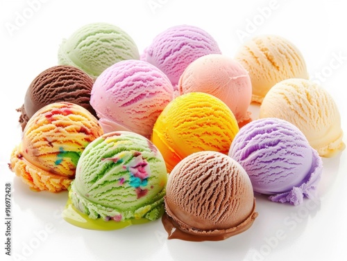 Assorted ice cream scoops arranged in a colorful display on a white background