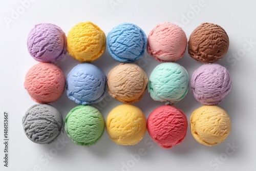 Assorted Ice Cream Scoops in Colorful Rows Overhead