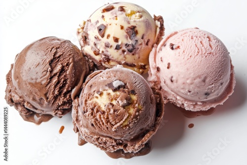 Assorted ice cream scoops in various flavors melting on a white surface, perfect for desserts
