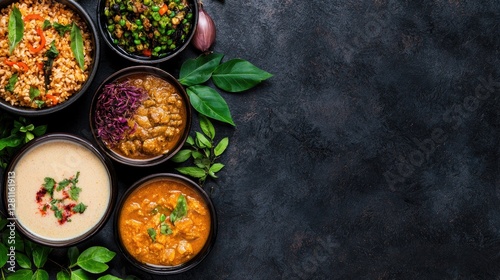 Assorted Indian Dishes Displayed on Dark Surface
