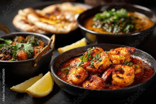 Assorted Indian food displayed on a black background with vibrant colors showcasing a feast of flavors and spices