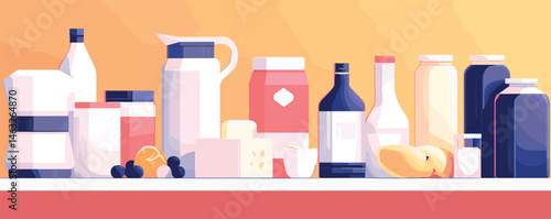 Assorted kitchen items in pastel colors on shelf against gradient background.