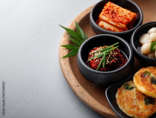Assorted Korean side dishes including kimchi seasoned vegetables and pickled vegetables served in black bowls on a wooden tray isolated on white background