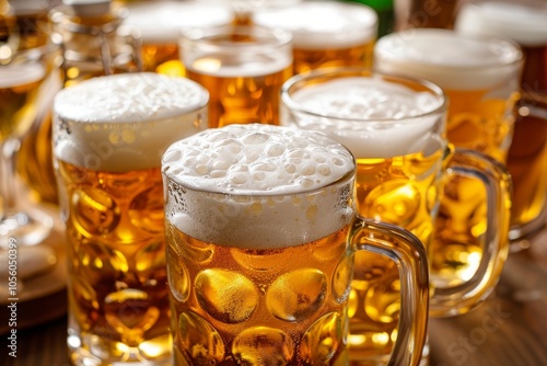 Assorted lager glasses of various sizes and styles displayed on a pub table for a vibrant selection