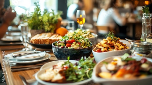 Assorted meal dishes served on dining table in cozy indoor restaurant