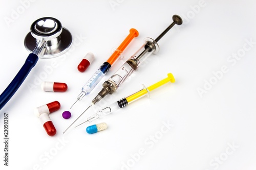 Assorted medical drugs and syringe on white background. Injection for the patient. Syringe, medical injection. Flu Treatment. Pharmaceutical industry.