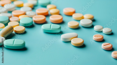 Assorted Medication Pills on Teal Background. An array of colorful medication pills scattered on a teal background, symbolizing healthcare and pharmacy.
