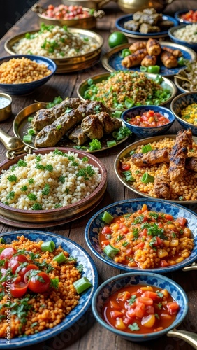 Assorted middle eastern dishes with couscous, vegetables, and grilled meats on wooden table