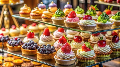 Assorted mini pastries, including fruit-topped and cream-filled delights, artfully arranged on a tiered stand behind a gleaming glass counter in a charming bakery setting.