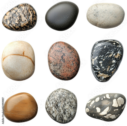 Assorted Natural Pebbles and Stones isolated on transparent background.