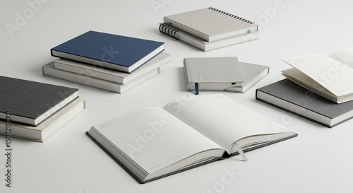 Assorted notebooks and journals, various colors and styles, on a white surface