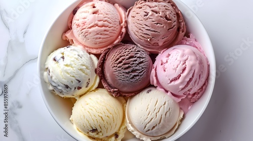 Assorted of scoops ice cream. Colorful set of ice cream of different flavours. Top view of ice cream isolated with mint, sauce