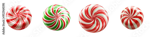 Assorted peppermint candies with vibrant red, white, and green swirls isolated on a white background, perfect for Christmas and holiday themes.