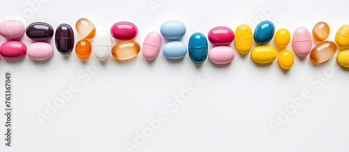 Assorted pills and capsules on a white surface