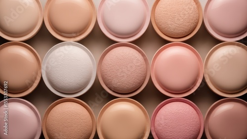 Assorted pink and beige makeup sponges and puffs in geometric arrangement