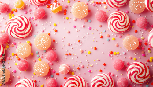 Assorted pink and white candies on a vibrant pink background with sprinkled colorful candies. Greeting card for National Candy Day. Concepts of confectionery, sweetness, and festive celebrations.