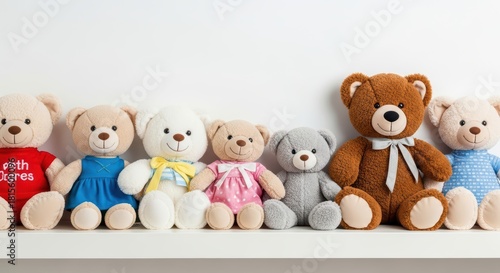 Assorted plush teddy bears in colorful outfits on shelf