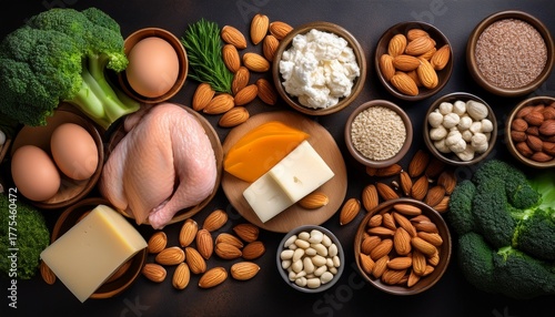 assorted protein rich foods such as almonds cheese chicken and broccoli are arranged on one side of a dark surface healthy eating and nutrition