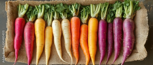 Assorted rainbow carrots displaying vibrant hues sit arranged neatly over burlap surface, showcasing natural beauty.