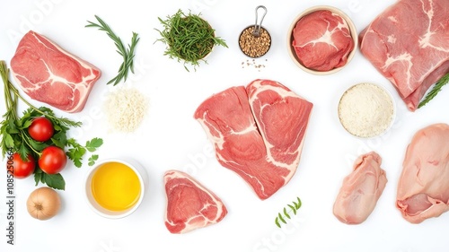Assorted raw meat selection including beef, chicken, and pork, displayed over a clean white background, white background, ingredients, variety