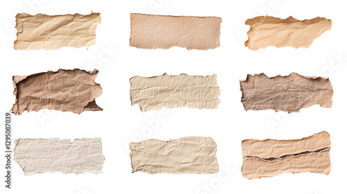 Assorted ripped textured paper strips isolated on transparent background - cut-out vintage collage design elements for text and messages.