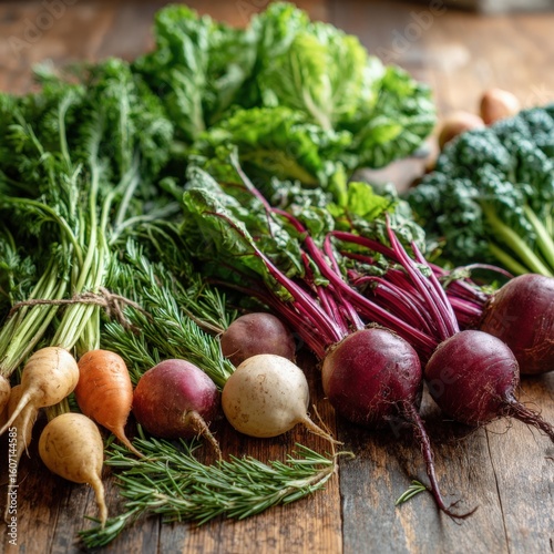 Assorted Root Vegetables, Greens, and Rosemary on Wood Surface