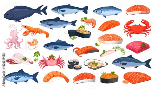 Assorted seafood illustration featuring fish, crab, shrimp, sushi, and salmon on white