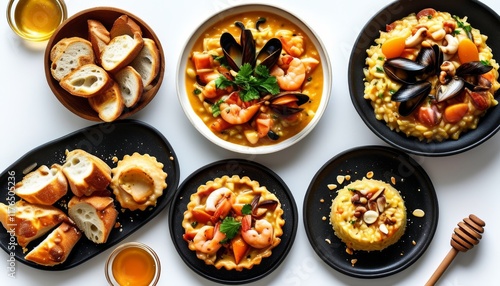 Assorted Seafood Risotto and Bread Platter with Fresh Ingredients and Garnishes