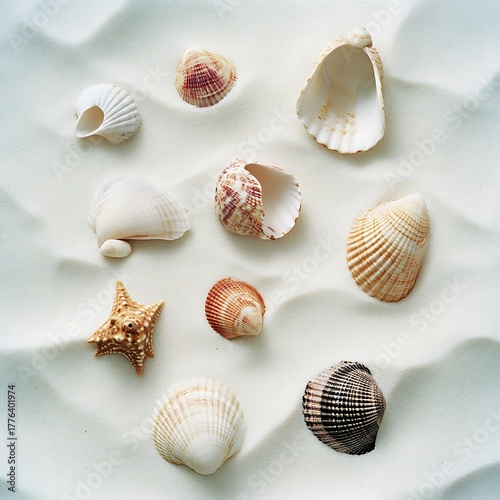 Assorted Seashells and Starfish on White Sandy Beach Background A Summer Still Life