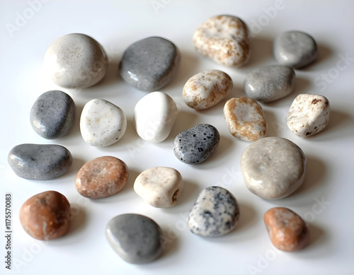 Assorted smooth river rocks and pebbles in various shapes, sizes, and colors including gray, white, brown, and spotted