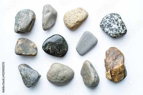 Assorted smooth stones arranged on a white surface