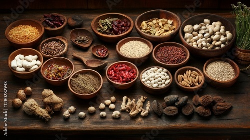 Assorted spices and herbs in wooden bowls on dark rustic table display