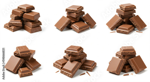 Assorted stacks of milk chocolate squares on a white background.