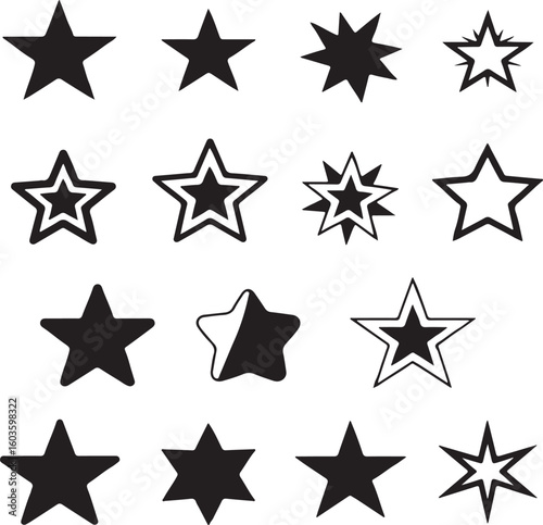 Assorted Star Illustrations A Collection of Varied Star Designs for Decoration and Creative Projects in Black and White