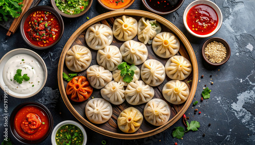 Assorted steamed dumplings arranged in a bamboo tray with a variety of colorful dipping sauces, showcasing traditional Asian cuisine and vibrant flavors in a rustic presentation.