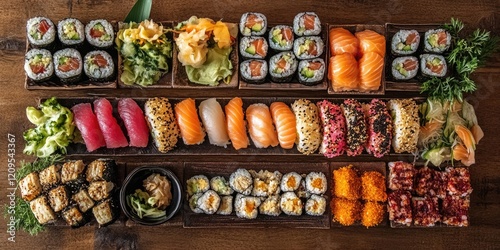 Assorted sushi platter on rustic wooden table with vibrant colors arranged in neat rows featuring maki, nigiri, and sashimi.