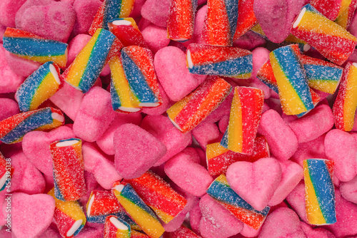 Assorted tasty gummy candies. Pink jelly sweets background.