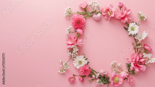 Assorted tiny blossoms arranged in a garland against a pink backdrop, featuring space for text, and Mother's Day, Ai Generated.